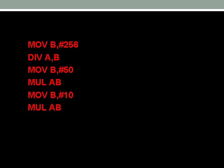 MOV B, #256 DIV A, B MOV B, #50 MUL AB MOV B, #10 MUL AB