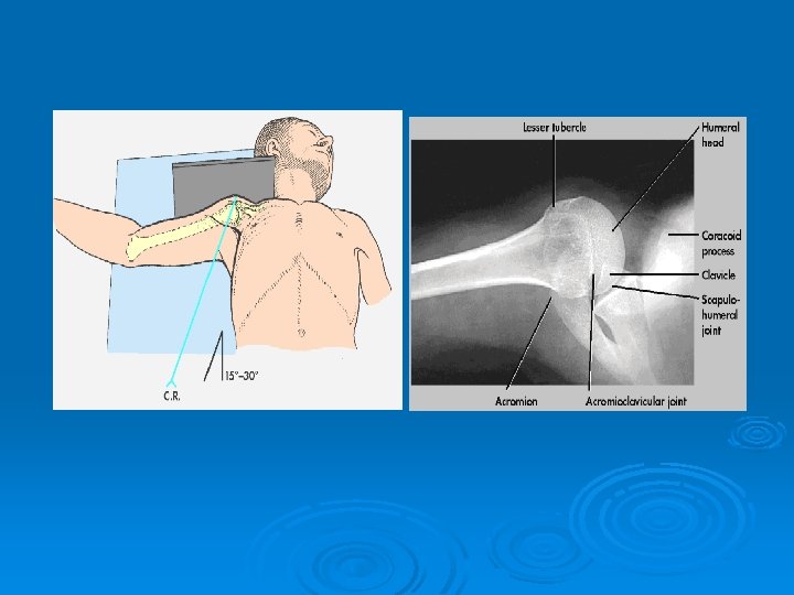 Patient Position Erect or Supine Part position Rotate patient 35 - 45 degrees towards affected side Dorsal surface of scapula parallel to film holder Place arm in normal anatomical position Humeral epicondyles equidistance from the film holder