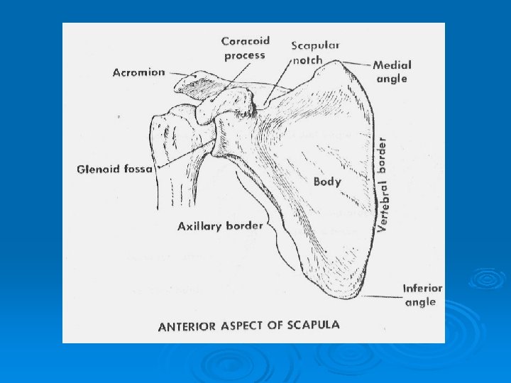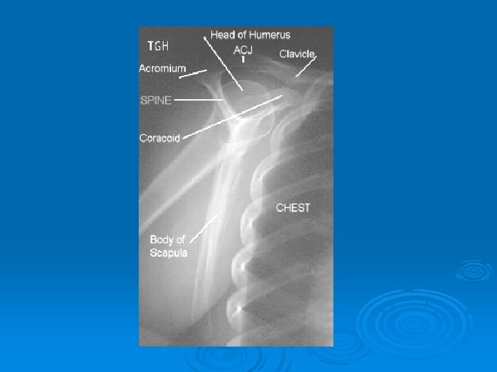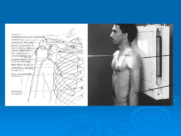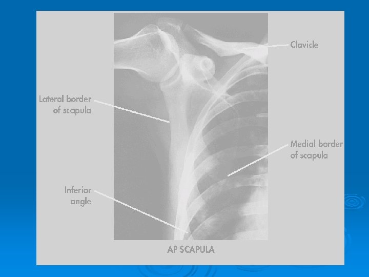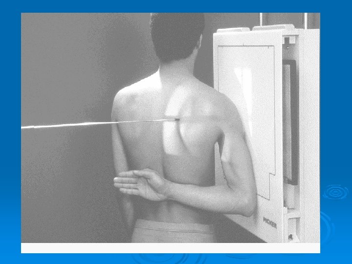 Ø Patient position Ø Erect or prone oblique (semi prone ) Ø Part position Ø Center affected scapula to cassette Ø Extend affected arm across affected chest Ø Adjust body so scapula in lateral and free Ø from ribs cage