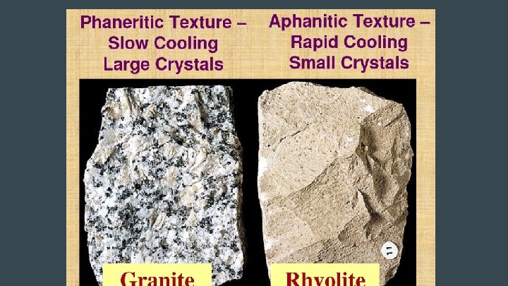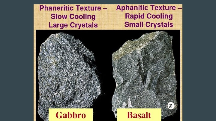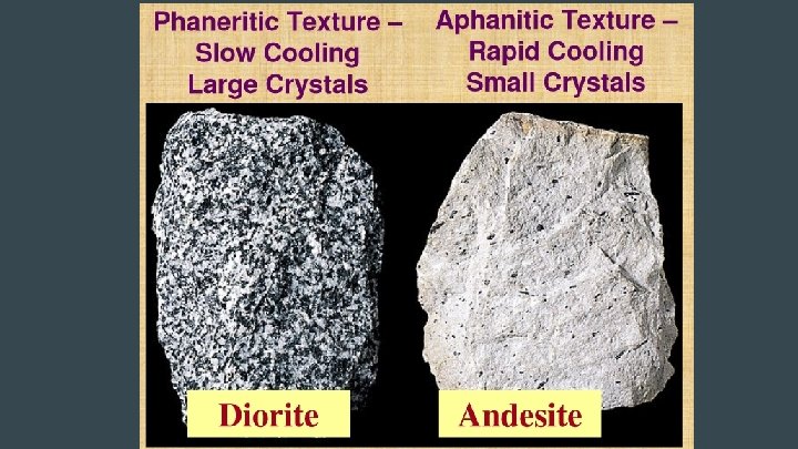 Textures - Phaneritic (coarse-grained) forms far below surface Slow Cooling Large Crystals Examples: Gabbro, diorite, and granite
