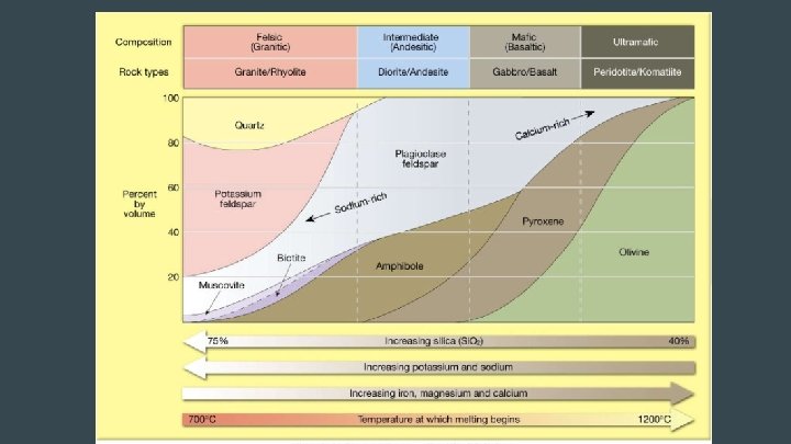 Igneous Mineral Composition Types - Felsic Have >65% silica, by weight, Contain light-colored minerals that are abundant in silica, aluminum, sodium and potassium Examples: Intrusive/extrusive - granite/rhyolite