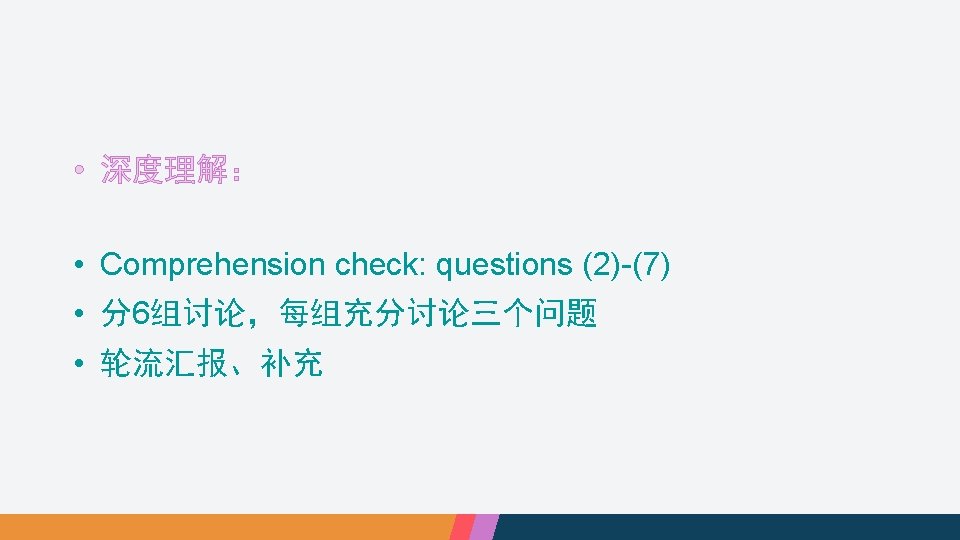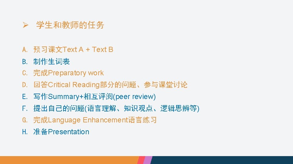 Ø 第二课时: Language Enhancement + Evaluation and Exploration • 语言理解: Paraphrasing, Translation, and beyond • 分组讨论并汇报: • Evaluating the text (1), (2) • Exploring beyond the text (1) - (3) • Making an outline: • 独立完成(5分钟) • 课堂点评(topic outline/sentence outline, intuitive thinking/theoretical thinking)