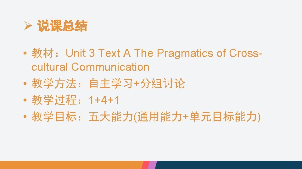 Ø 第三课时:Text A: Evaluation and Exploration + Presentations • Asking your own questions:讨论、汇报、点评 • 补充新的问题:pragmatics and pragmatics? • Presentations: • Evaluating the text (3) (p 61) • Intercultural reflection (2), (3) (p 74) • 10 minutes + Q&A (3 mins) + Comments • 课后延时书面点评