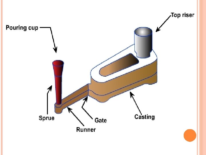 1. SPRUE Ø Channel through which molten metal is brought in to the mould Ø It may be square or round in shape.