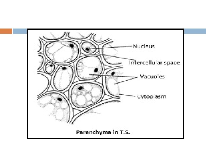 CONT…. These cells are closely packed or may have small intercellular space They are made up of thin cell wall made up of cellulose, hemicellulose Plasmodesmata join the cells of the parenchyma tissue They have several small vacuoles. In the older parenchyma, smaller vacuoles merge to become a large central vacuole, which may accumulate anthocyanin or tannins Water is abundant in the vacuoles of the parenchyma cells that act as a water reservoir Storage parenchyma cells may have thick xyloglucan walls e. g. in the endosperm of the date palm. The