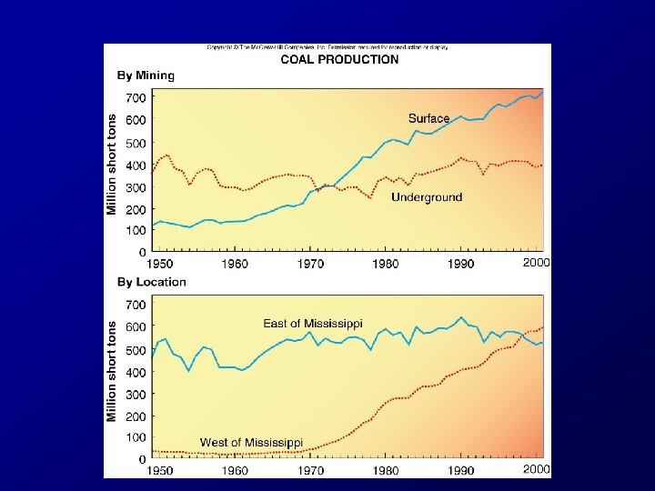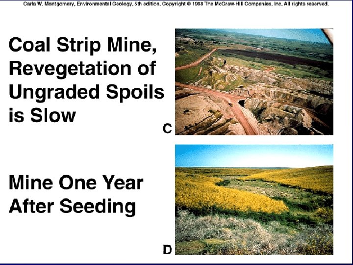 Coal-Mining Hazards and Environmental Impacts • Underground mining of coal is dangerous and expensive – Mines can collapse – Miners contract black lung disease from coal dust or cancer from radon gas – Explosion occur from pockets of natural gas • Strip mining exposes the coal to the weather – Rain water and air comes in contact with sulfur in the coal beds or waste rock – produces sulfuric acid Pyrite + water + oxygen = sulfuric acid + hydrated iron oxide • Coal mine reclamation is expensive and time consuming