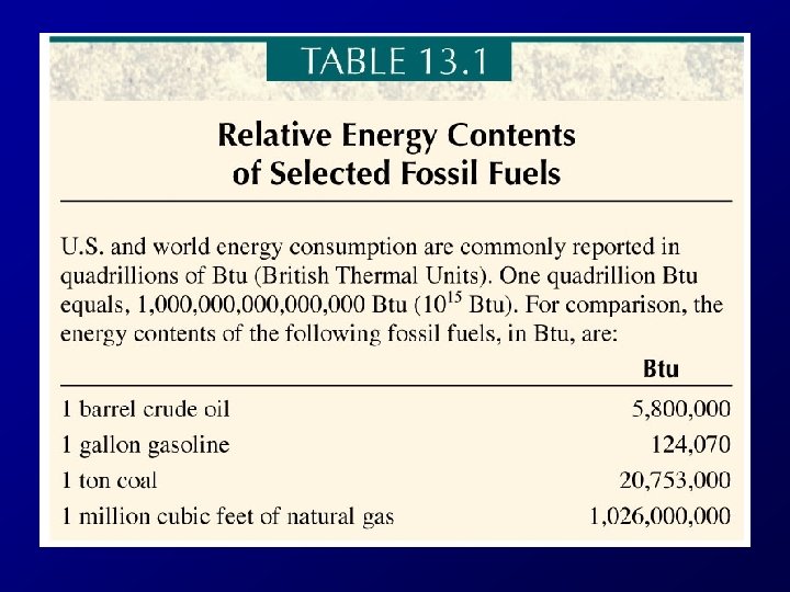 Fossil Fuels • energy stored in chemical bonds of ancient organic life – Oil – Natural gas – Coal – Oil shale – Tar sand • When we burn them, we are using that stored energy