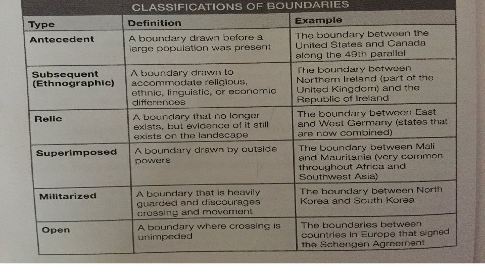 1. Delimited boundary 2. Defined boundary 3. Demarcated boundary A. B. C. D. E. F. Delimited boundary – line on a map, A Defined boundary – legal document, B, E, J Demarcated boundary – physical objects, C, D, F, G, H, I G. H. I. J. Line on a map Treaty Disabled parking sign Traffic cone Mortgage for a home/home survey A sign indicting a Drug Free School Zone Gang graffiti Fence Wall Law establishing a Drug free School zone