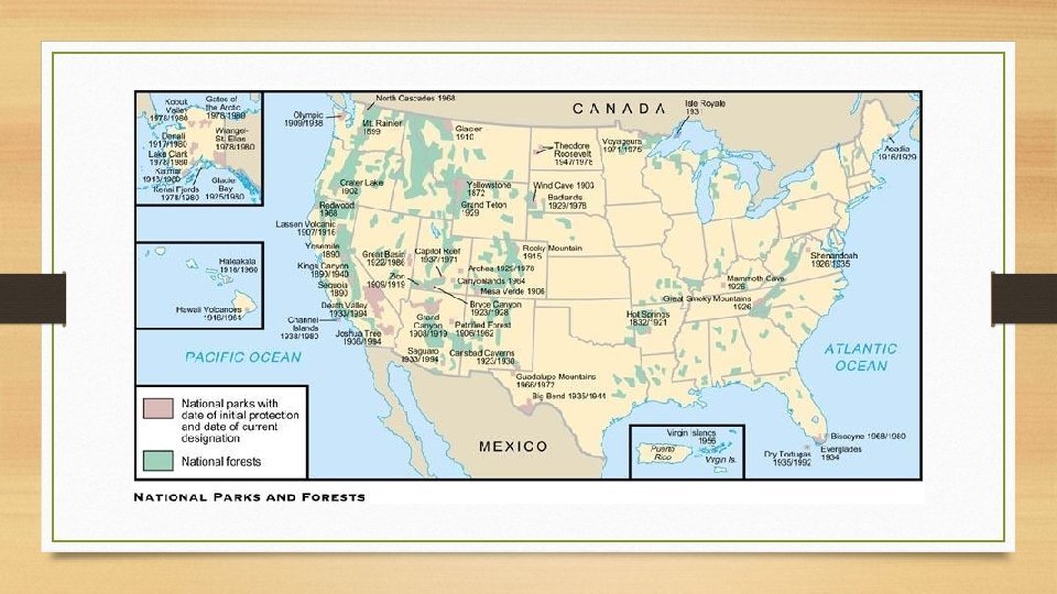 • Roosevelt set aside 148 million acres of forest reserves, 1. 5 million acres of water-power sites, 50 wildlife sanctuaries, and several national parks.