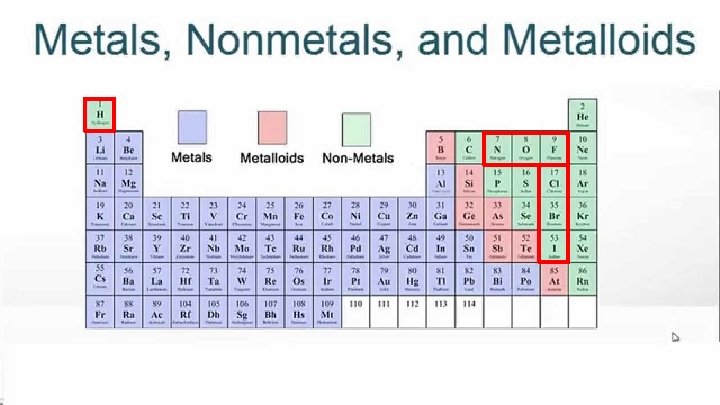 Memorize These!!! ● Elements that exist as diatomic molecules Br I N Bromine (Br 2) Iodine (I 2) Nitrogen (N 2) Chlorine (Cl 2) Cl H O F Hydrogen (H 2) Oxygen (O 2) Fluorine (F 2)