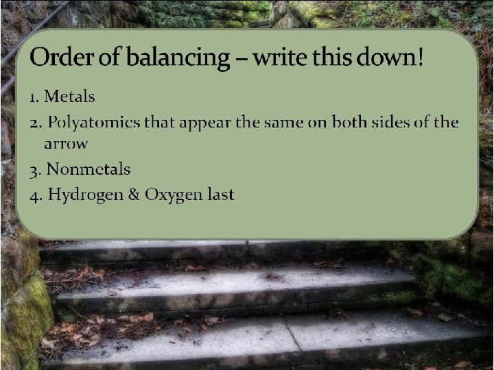 Balancing Steps 1. If you are given a word equation, write the chemical equation with the correct formulas and symbols- don’t forget diatomics 2. Add coefficients to the formulas to make the number of atoms of each element on both sides of the equation the same. 3. You may not add coefficients to the middle of a formula.