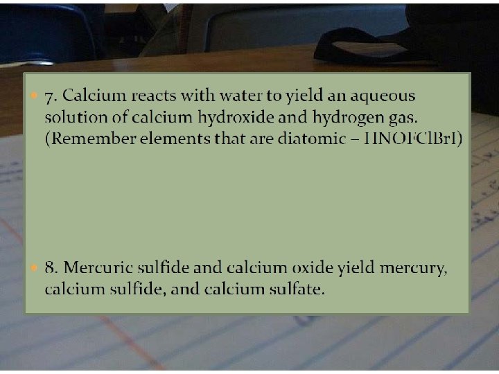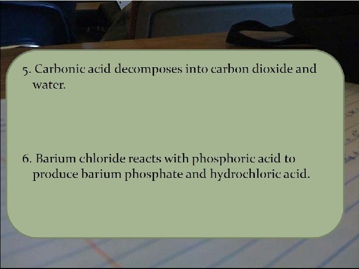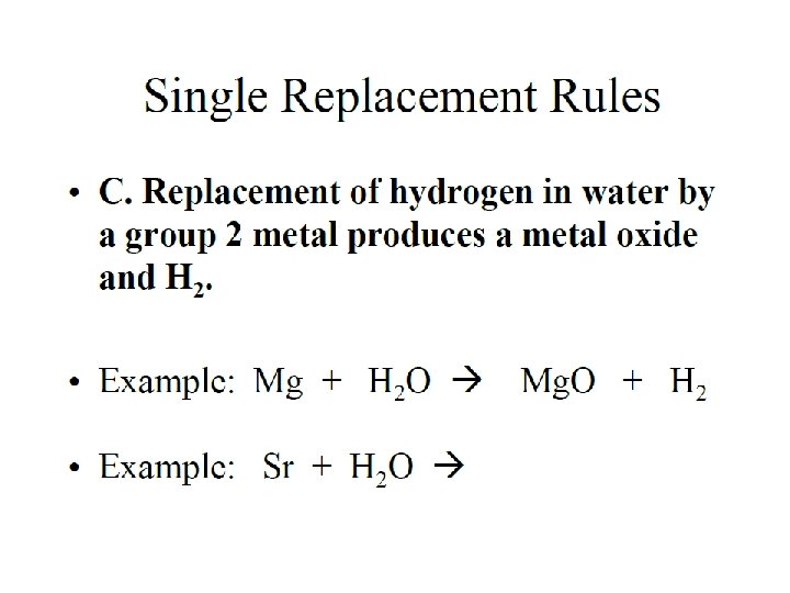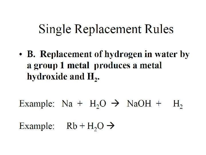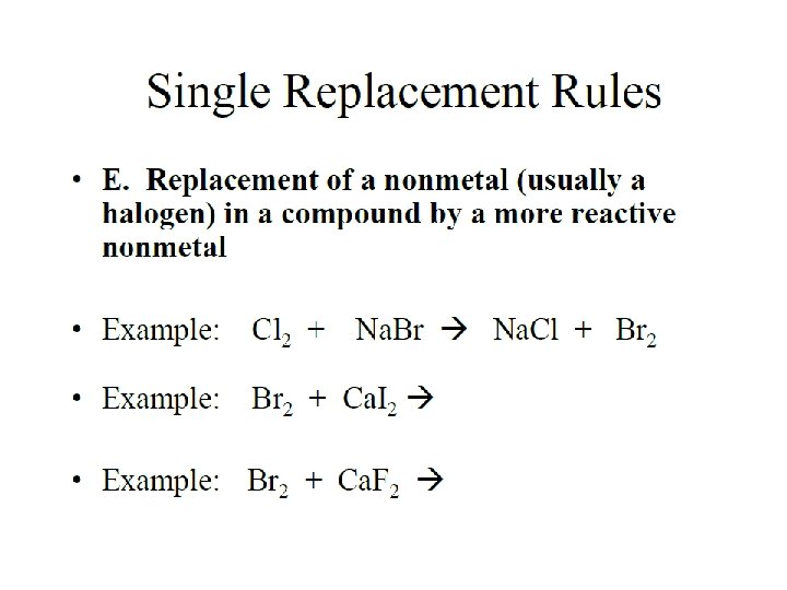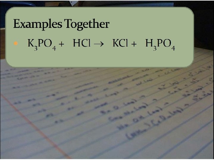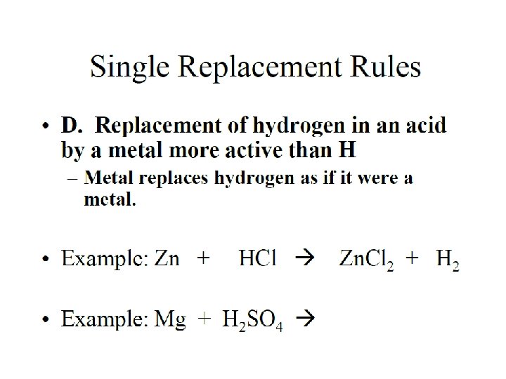 Double-Replacement Formation of a gas. HCl (aq) + Fe. S (s) → Fe. Cl 2 (aq) + H 2 S (g) Formation of water. HCl (aq) + Na. OH (aq) → Na. Cl (aq) + H 2 O (l) Formation of product which decomposes. Ca. CO 3 (s) + HCl (aq) → Ca. Cl 2 (aq) + CO 2(g) + H 2 O (l) *extra rules in notes*