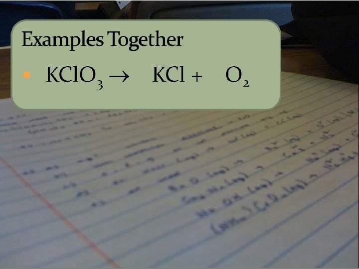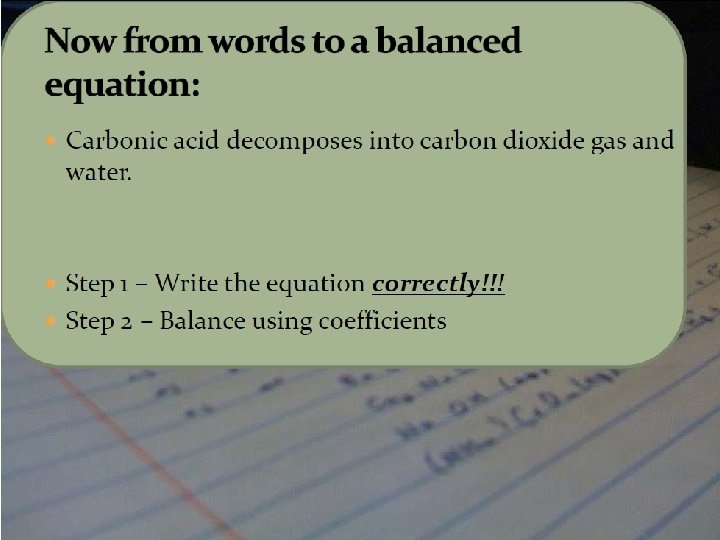 Writing Equations from words: Start with a skeleton equation: -Write the formulas of the reactants on the left side of the yield sign and products on the right side Fe+O 2→Fe 2 O 3 -Next add information like physical states, catalysts involved, etc. Fe(s)+O 2(g)→Fe 2 O 3(s) -Then you need to balance the equation.