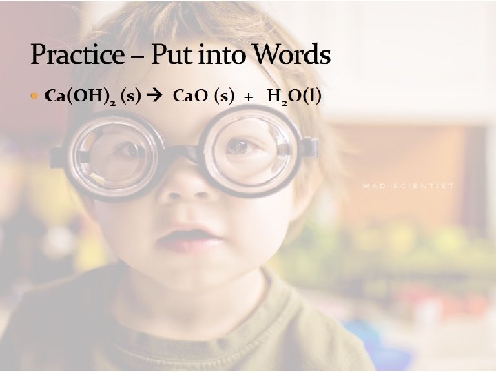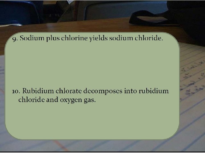Reading Equations Na. Cl (aq) + Ag. NO 3 (aq) Na. NO 3 (aq) + Ag. Cl (s) This reads: A water solution of sodium chloride reacts with a water solution of silver nitrate to yield a water solution of sodium nitrate and a precipitate (solid) of silver chloride.