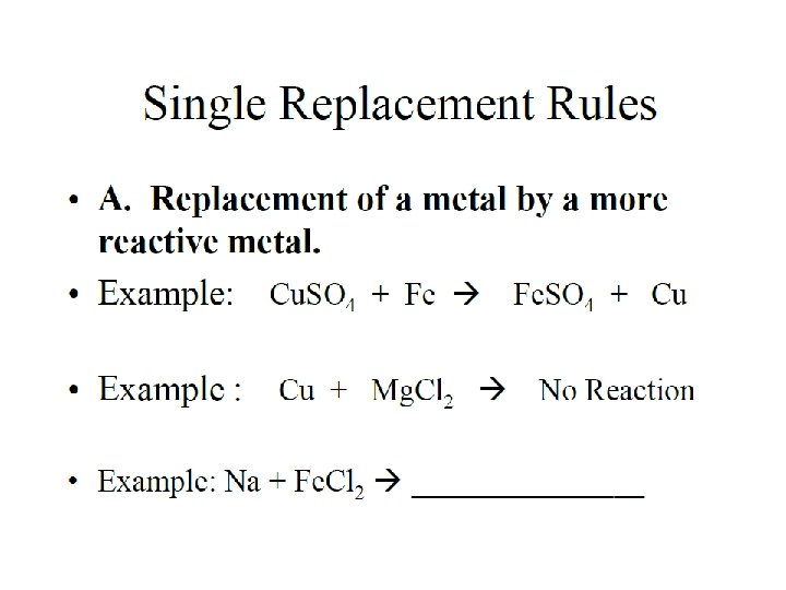 Single-Replacement Reaction • A chemical change in which one element replaces another in a compound – metal replaces metal (+) – nonmetal replaces nonmetal (-) A + BC → B + AC