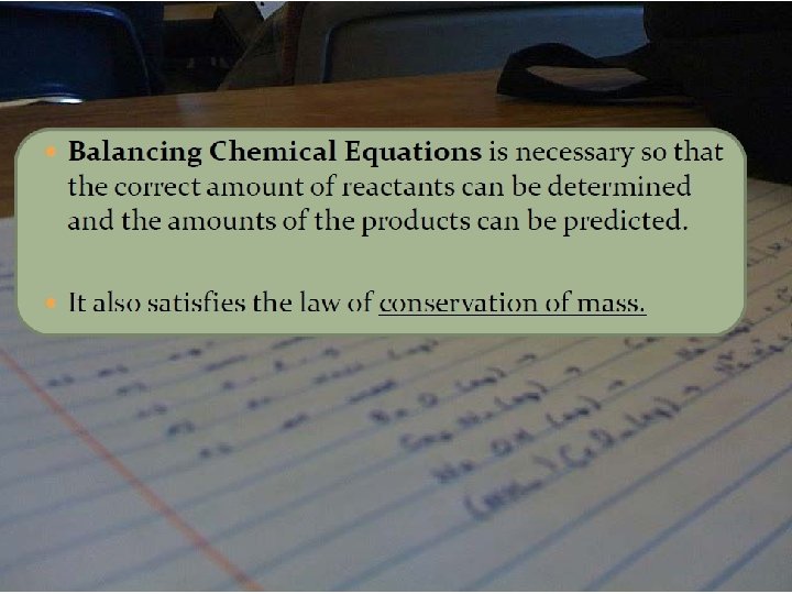Chemical Reactions Since matter can not be created or destroyed, chemical reactions must be balanced in terms of mass. The amount of mass you Reactants → Products start with must be equal to the mass of the 100 g total = 100 g total products.