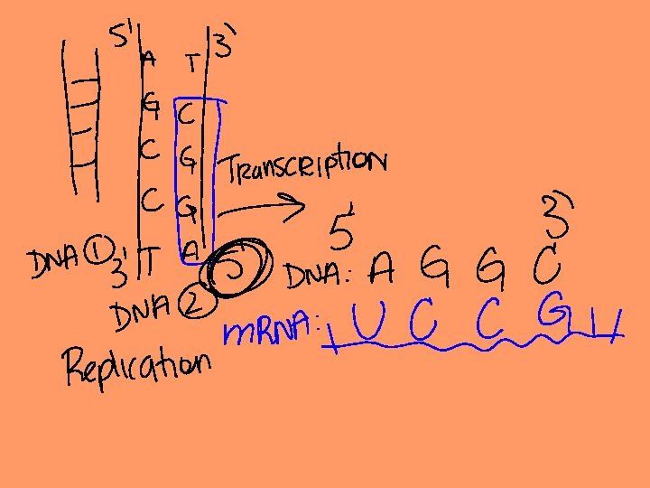b. Transcription (DNA→RNA) i. RNA copies are created from DNA in the nucleus 1. RNA polymerase is an enzyme that uses only one side of DNA as a template to create a single strand of RNA. 2. New bases are added to a growing m. RNA strand in a 5’ to 3’ direction. 3. base pairing rules: (A with U, G with C, T with A). Ex. DNA = ATTCGCATT RNA = UAAGCGUAA
