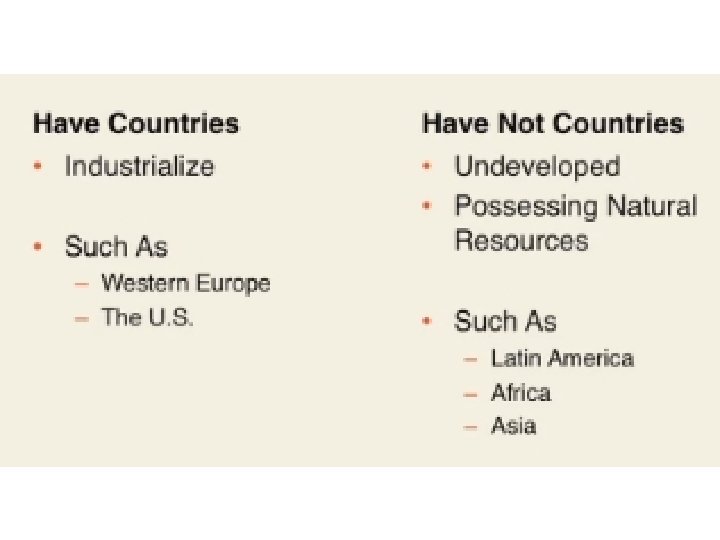 • Other regions in the world become suppliers of goods and raw materials for the industrialized – Latin America (sugar, coffee, bananas, meat) • Argentina has a lot of beef • Guano (bat poop) fertilizer from Peru – Africa (palm oil, rubber, diamonds) • Palm oil – lubricant for machines – China – silk, porcelain, tea • Leads to imbalance of trade (all British silver going to China)