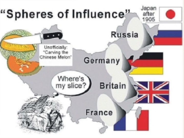 • Imperialism in China • China was amassing silver in exchange for their goods of silk, porcelain and especially tea – Didn’t want non-Chinese stuff • Qing Dynasty controls trade (only opens one port) • Britain tried to reverse this imbalance of trade by selling opium to China which caused the Opium war – Used steamships to enter China through India – Indians grew the Opium under British rule – Emperor writes letter to Queen Victoria to stop opium imports – Opium war was lost by China which resulted in unequal treaties and China being divided into spheres of influence by Europeans (places where they could trade)