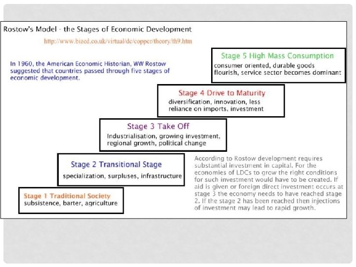 ROSTOW – STAGE THREE (TAKE OFF) • Development of manufacturing (a country’s own companies for export) • Moves to next stage with even more investment in this sector and the creation of modern social, economic, and political institutions
