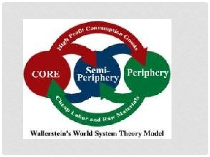 WORLD SYSTEM THEORY - CORE • • • CORE: North America, Western Europe, East Asia The world’s richer countries Wide range of products and services High wages Import raw materials and export manufactured goods/services • Have favorable trade balances with poor countries • Invests in other core country economies