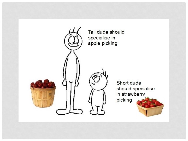24. COMPARATIVE ADVANTAGE • Countries should specialize in producing those goods of which they are relatively more efficient producers • These countries should then trade with the rest of the world to obtain needed commodities • If countries do specialize this way, total world production will be greater • Example: check out next slide