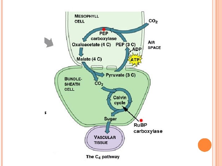 C 4 EXTREMELY IMPORTANT THE BUNDLE SHEETH CELLS ARE IMPERMEABLE TO CO 2!! Why is this important? Carbons are really stow-aways Move 4 th Carbon into bundle sheath cell Separate from Malate – Malate leaves – NOT CO 2 Once in, cannot leave Thus C 4 concentrates CO 2 in Sheath Cells