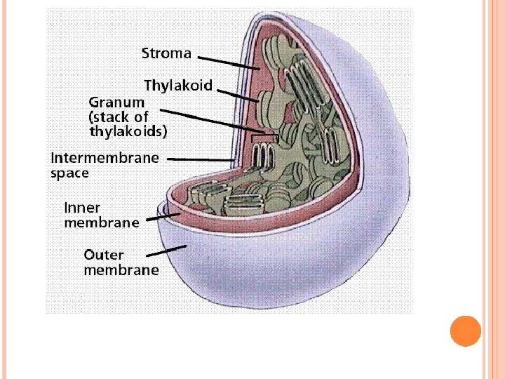 ANATOMY OF PHOTOSYNTHESIS Leaf Major site of photosynthesis; although can occur all over Plant Mesophyl – tissue in interior of leaf Stomata – Pores; take in CO 2 release O 2 Vein – Transport water absorbed by roots Chloroplasts Organelle of photosynthesis 2 membranes; Thylakoids – houses light absorbing pigments thylakoid sacs are stacked – named Granum Stroma & thylakoid space