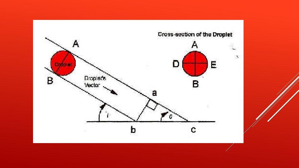 SHAPE OF BLOOD DROPS AT AN ANGLE When a droplet of blood strikes a perpendicular surface (90 degree angle), the resulting bloodstain will be circular. That being the length and width of the stain will be equal. There will be no tail and no build-up of blood. Blood that strikes a surface at an angle less than 90 degrees will be elongated or have a tear drop shape. Blood that strikes a surface at more than 90 degrees will have more build-up of blood. Build-up of blood