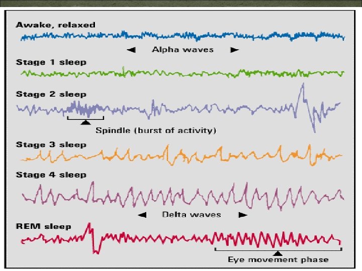 Stages of Sleep: Brain Waves �Awake brain generates Beta Waves �As you prepare for sleep, brain generates Alpha Waves �After you begin to sleep, the brain generates Theta Waves �The deepest parts of sleep are characterized by Delta Waves