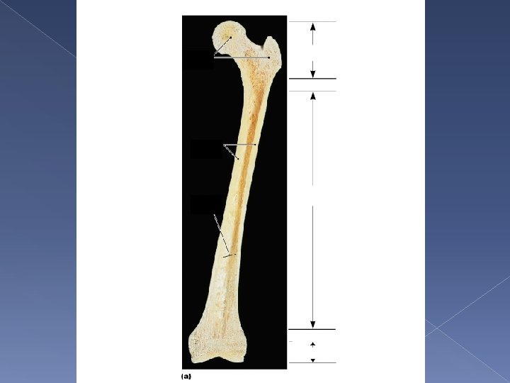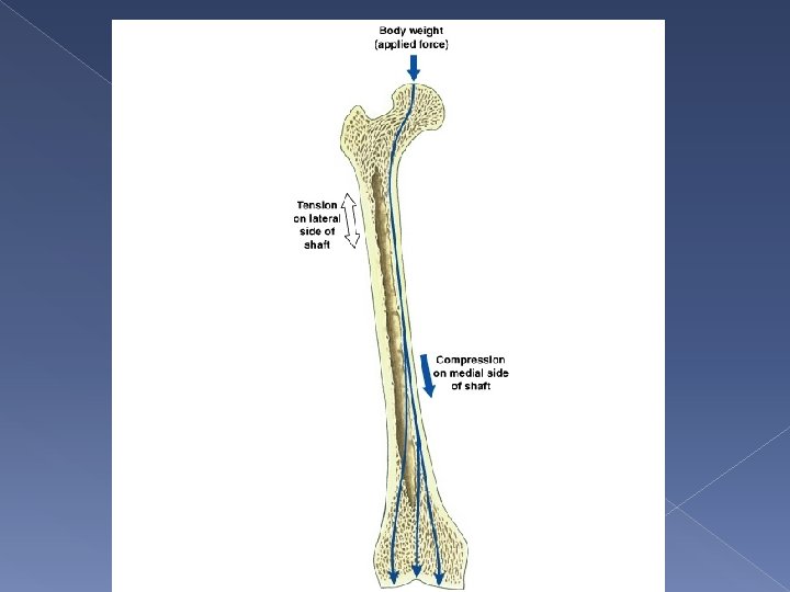 Structure of Compact Bone Compact bone is thickest where stresses arrive from limited directions Osteons in diaphysis are parallel to long axis › Shaft doesn’t bend. Your femur can withstand 15 times your body weight through long axis Much less force from the side will fracture your femur