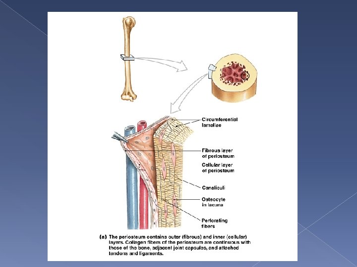Periosteum and Endosteum Periosteum covers superficial layer of compact bone, except at joints › 3 functions 1. Isolates bone from surrounding tissue 2. Provides route for circulatory and nervous supply 3. Actively participates in bone growth and repair Periosteum is interwoven with the synovial capsules and with tendons