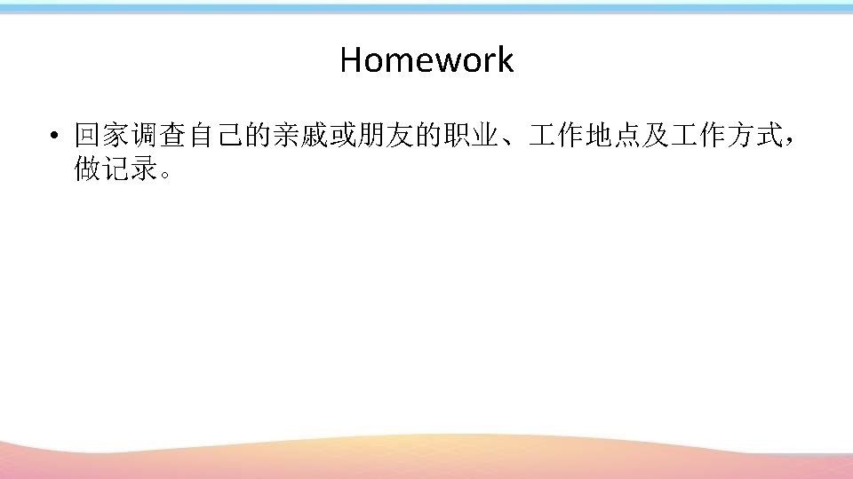 Let’s talk Mike: My uncle is a fisherman. Xiao Yu: Where does he work? Mike: He works at sea. He sees lots of fish every day! Xiao Yu: I see. How does he go to work? By boat? Mike: No. He works on a boat. He goes to work by bike. Xiao Yu: He has a very healthy life. Mike: Yes. He works very hard and stays healthy.