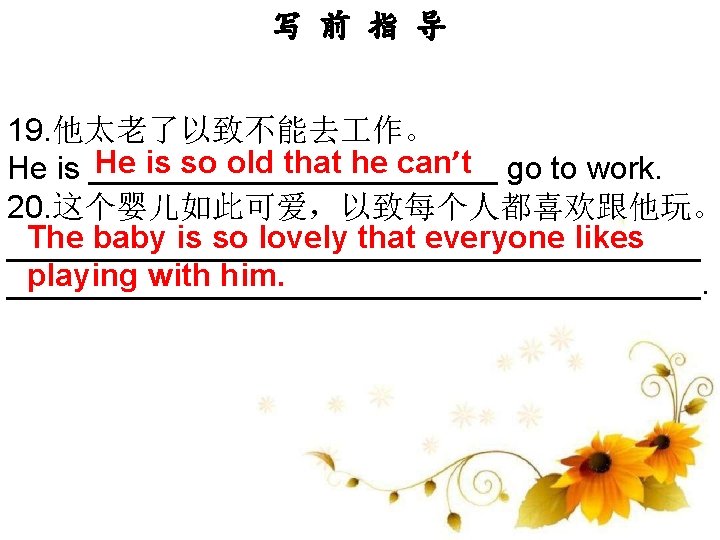 写 前 指 导 一、根据文章内容,完成下列信息卡。 The name of the dog Steve 1. _________ The place the dog come 2. ________ The USA from ________ 3 years old The age of the dog 3. ________ The thing the dog like doing 4. ________ Taking a walk every afternoon _________ about 5. Talking ________ The thing the writer would the bad things _________ like to do when he is sad with Steve _________