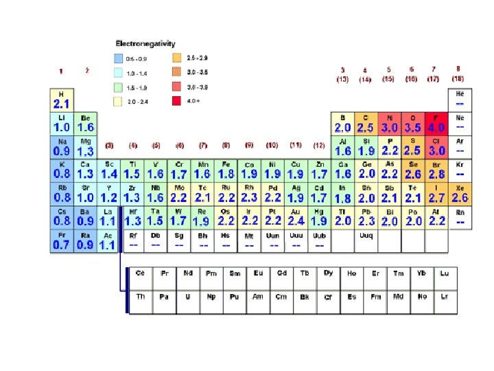 Bond Classification Probable Bond Type Electronegativity difference Nonpolar Covalent 0. 0 -0. 4 Moderately polar Covalent 0. 5 -1. 0 Very polar Covalent 1. 0 -2. 0 Ionic >2. 0