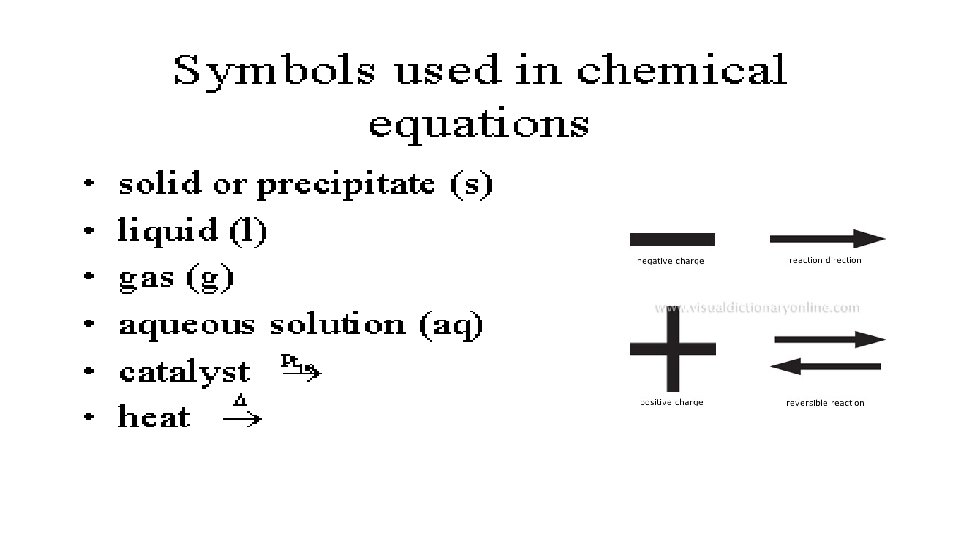 • the arrow (--->) means reacts to yield or yields • Formula equation: represents the reactants and products of the chemical reaction by their symbols or formulas