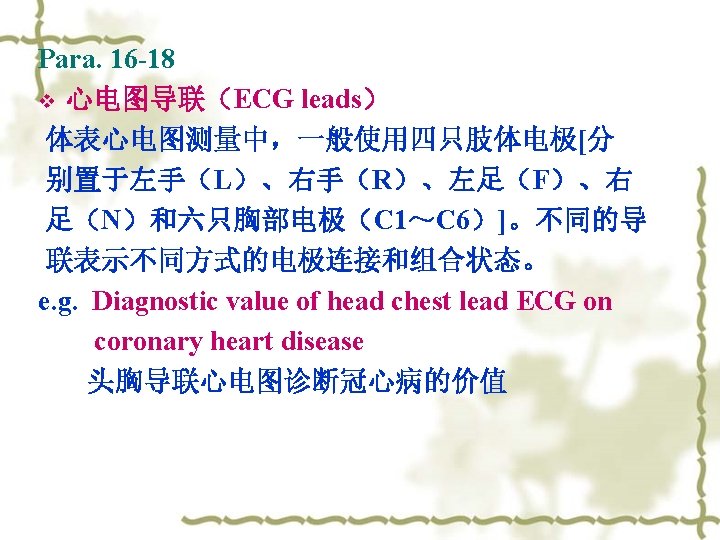 anesthesia/aneasthesia ----(Greek word aisthēsis means “sensation”, a/an----without ) 1. 感觉缺失, 麻木 2. 麻醉 angina----from Greek meaning “strangling“(窒息) pectoris---- from Latin meaning "chest" angina pectoris can therefore be translated as "a strangling feeling in the chest".