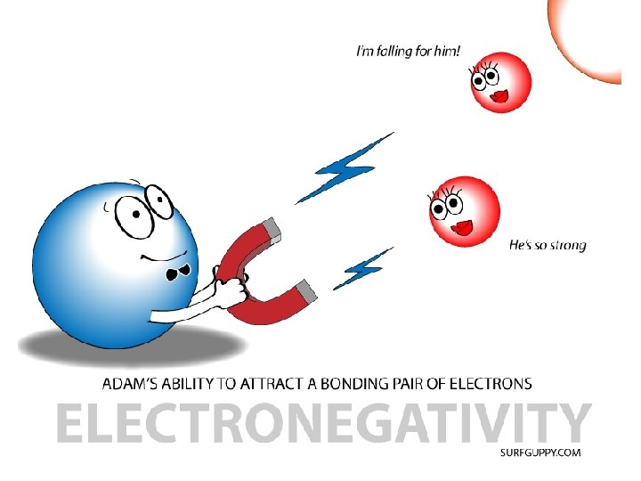 Electronegativity • The electronegativity of an atom is its tendency to attract electrons from a neighbouring atom. • Going down the periodic table, atoms have a _____ radius, and thus a _____ attraction to the outer electrons of another atom. • Going left to right, atoms have a _____ radius, and thus a _____ attraction to the outer electrons of another atom.