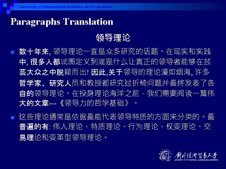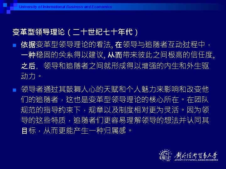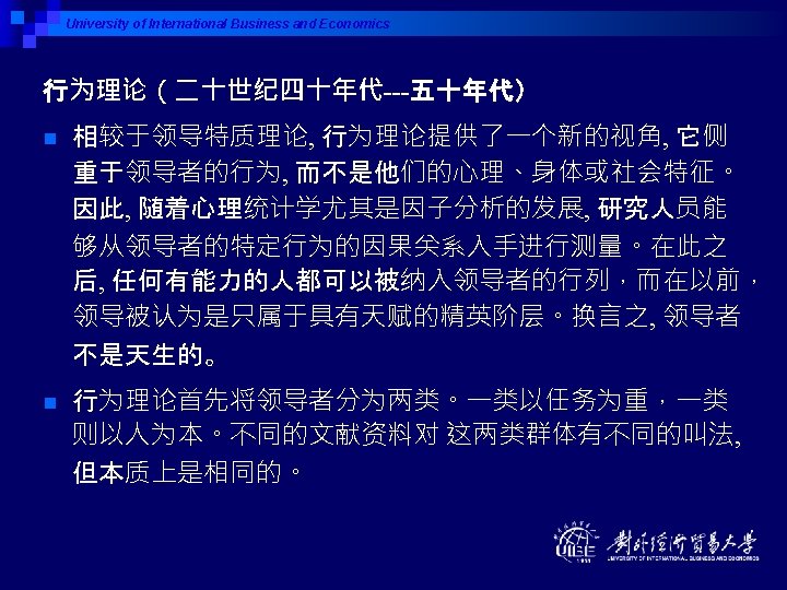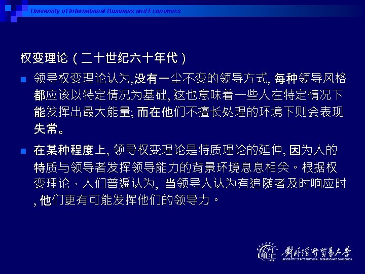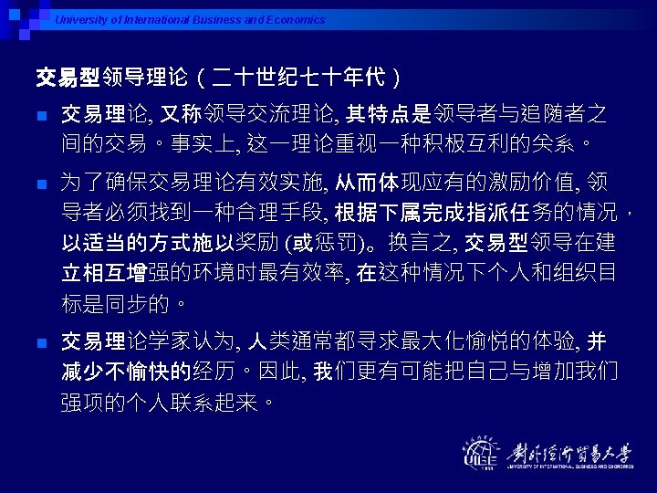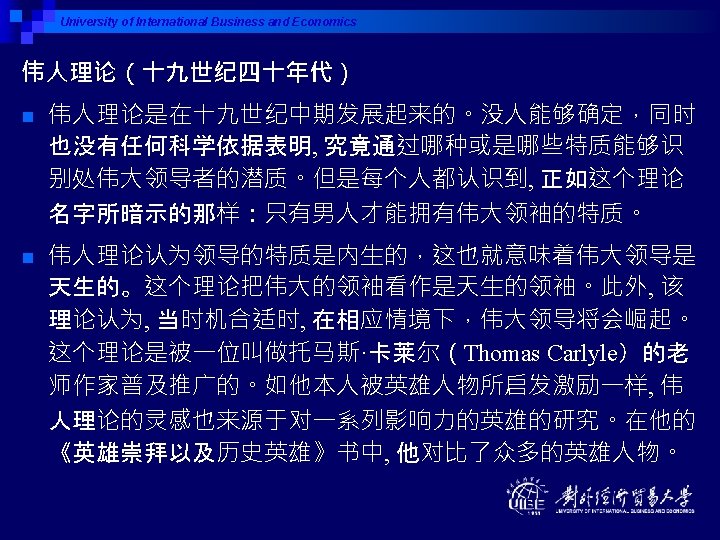 University of International Business and Economics 4. evolve: [ɪ'vɑlv] v. to come forth gradually into being; develop形成;逐步发展 【例】The Great Man theory evolved around the mid-19 th century. 【举一反三】: 5. intrinsic: [ɪn'trɪnsɪk] adj. belonging to the essential nature or constitution of a thing ·内在的;本身的 【例】The Great Man theory assumes that the traits of leadership are intrinsic. 【举一反三】: