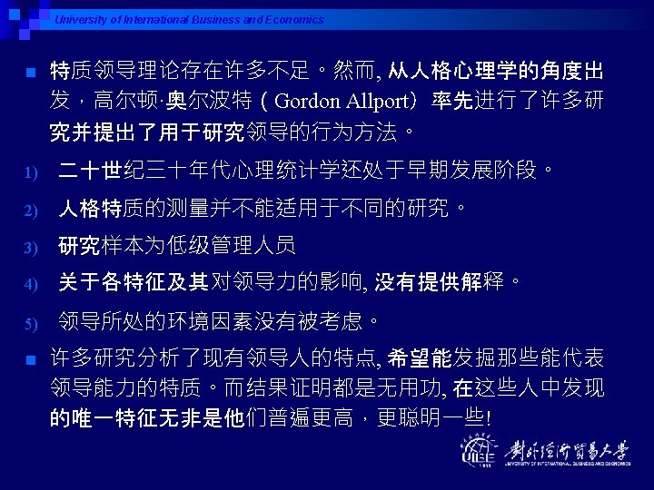 University of International Business and Economics n Many studies have analyzed the traits among existing leaders in the hope of __________, _____ those responsible for ones leadership abilities n Throughout the literature these are __________, ______ different names, but the essence are _____, _____ n A _____ and _____relationship n _____and_____ are in sync n Maximize _____ and diminish _____