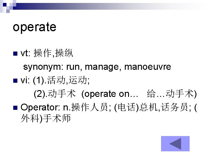 achieve vt. get by effort n Achievement: n. 成绩; 得到 n Eg: He went back home without having achieved any success. n