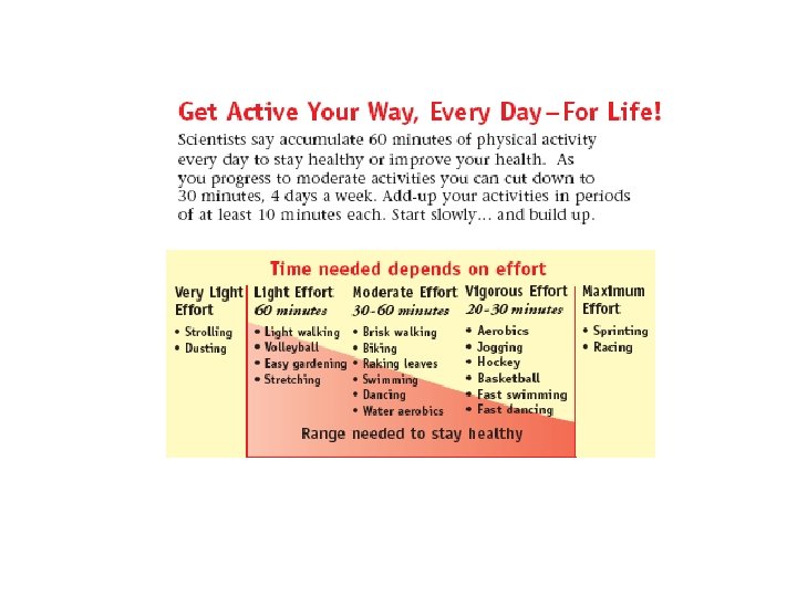 Where to start? ? Have a doctor examine you before you begin exercising if you are over 35 or at high risk Have someone who specializes in exercise supervise you –Increase activity level GRADUALLY!!
