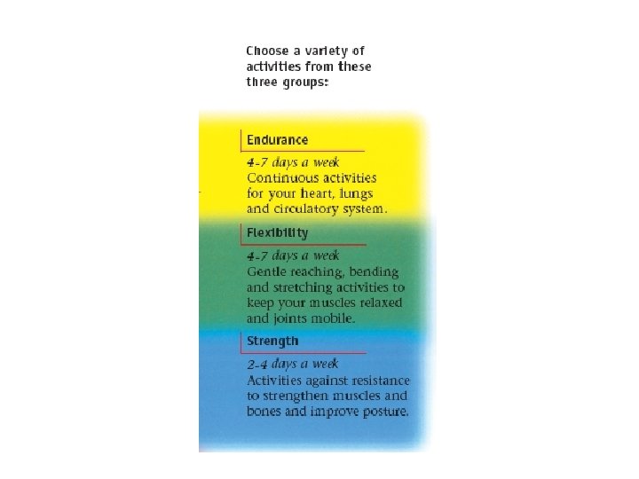 Determining if you are overtraining • Exercise can become a compulsion: “I have to do it no matter what!” • Overtraining signs include: – Persistent pain, especially of the joints – Increased difficulty performing a standard exercise level – Increases susceptibility to infections. Ie. Influenza, acne – Feeling tired, lacking energy, lack of enthusiasm • If you are experiencing these signs: REST!!!!