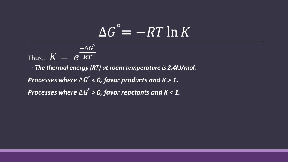 So how does this help? If ΔG<0, the products are favored at equilibrium and the forward process is said to be “thermodynamically favored. ” If ΔG>0, the reactants are favored at equilibrium and the reverse reaction is said to be “thermodynamically favored. ” If ΔG=0, the reaction is at equilibrium and there is no driving force in either direction.
