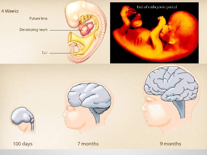 EMBRYONIC STAGE: Week 3: Development of neural tube (day 18), Beginning of blood circulation (day 24) Possible abnormal events: Twins, Teratogens (foreign substances that influence the developing fetus) are very damaging from week 3 to week 8. Weeks 4 -8: Formation of head, tail, and lateral folds. Formation of primitive gut. Heart moves to normal position. Appearances of brain, limbs, eyes, ears, & nose. Development of human-like appearance.