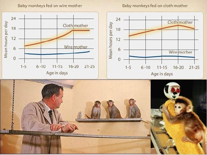 In the mid-1950 s, the behavior theory of attachment came into question as a result of Harry Harlow's famous studies of attachment in infant rhesus monkeys. Harlow removed newborn monkeys from their mothers at birth and raised them in the laboratory with two types of artificial mothers. Which mother do you think the monkey will choose?