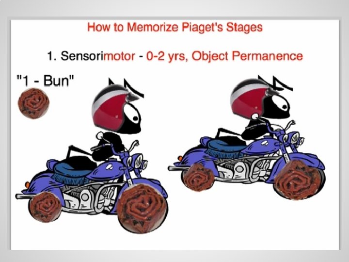 How to Memorize Piaget’s Stages Peg Word System: 1 is a “Bun”-- the “buns” are the wheels on the 2 ‘motorcycle’ Pair of Ants are riding the motorcycles. 2 is a “Shoe” -- PREacher, with a rabbit coming out of his hat; Smokey the Bear with the stupid shoes on as well; AND a donkey (ass) - each with ridiculous shoes on! 3 is a “Tree” -- Tree with logs, & comb 4 is a “Door” -- Big Wide Door - 4 Males with great abs.