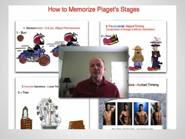 How to Memorize Piaget’s Stages Society for the Prevention of Cruelty to Fruit 1. Sensorimotor - “motor” --> Motorcycle Object Permanence: “Pair of Ants” (stage is to age 2) 2. Preoperational - “opera” or “operation” or “preacher” Magical Thinking: “rabbit out of a hat” Conservation: “Smokey the Bear” Assimilation: “Ass (or donkey)” or “Butt!” 3. Concrete Operations - Logical Thinking, Accommodation “Concrete Block” “Logs” “Comb” 4. Formal Operations - Abstract Thinking “Suit” “ 4 Males”
