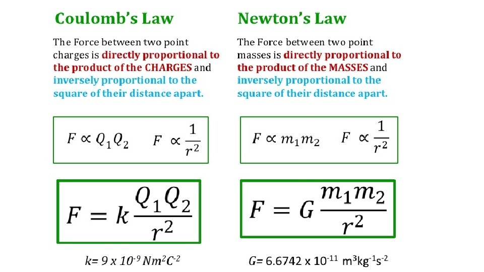 • Newton’s law of gravitation for masses is similar to Coulomb’s law for electric charges. • Gravitational force of attraction between a pair of one-kg masses is extremely small, • Electrical force between a pair of one-coulomb charge is extremely large. Difference between gravitation & electrical forces is gravity only attracts but electrical forces may attract or repel.