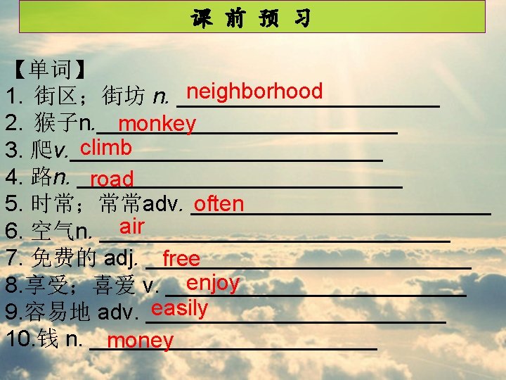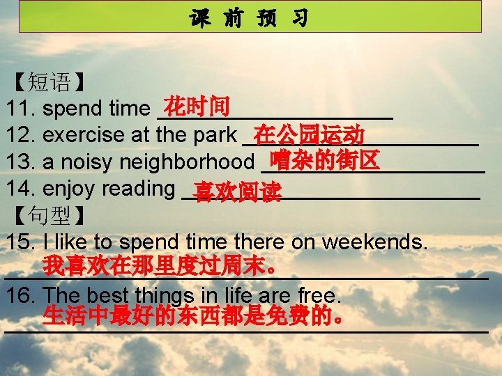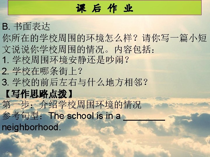 课 后 作 业 ____________________ Our school is in a quiet neighborhood. Its on ____________________ Pingan Street. In front of our school, there is ____________________ a bus stop. We can take a bus there ____________________ easily. On its right, its our town library. Many ____________________ students enjoy reading there after ____________________ school. There is a big bookstore on its ____________________ left. And behind our school, its Childrens ____________________ Park. We often exercise at the park because ____________________ we love the clean air and sunshine. We all ____________________ love our school.